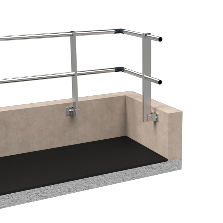 Notre garde-corps avec l'embase 3-en-1 peut être fixé à plat sur le dessus de l'acrotère (à la francaise) ou verticalement sur le côté de l'acrotère (à l'anglaise).