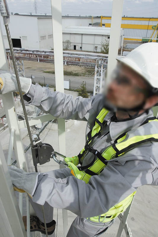 Elle est équipée d’un coulisseau antichute autobloquant lors d’un mouvement vertical vers le bas, et permets donc de retenir l’opérateur en cas de chute.